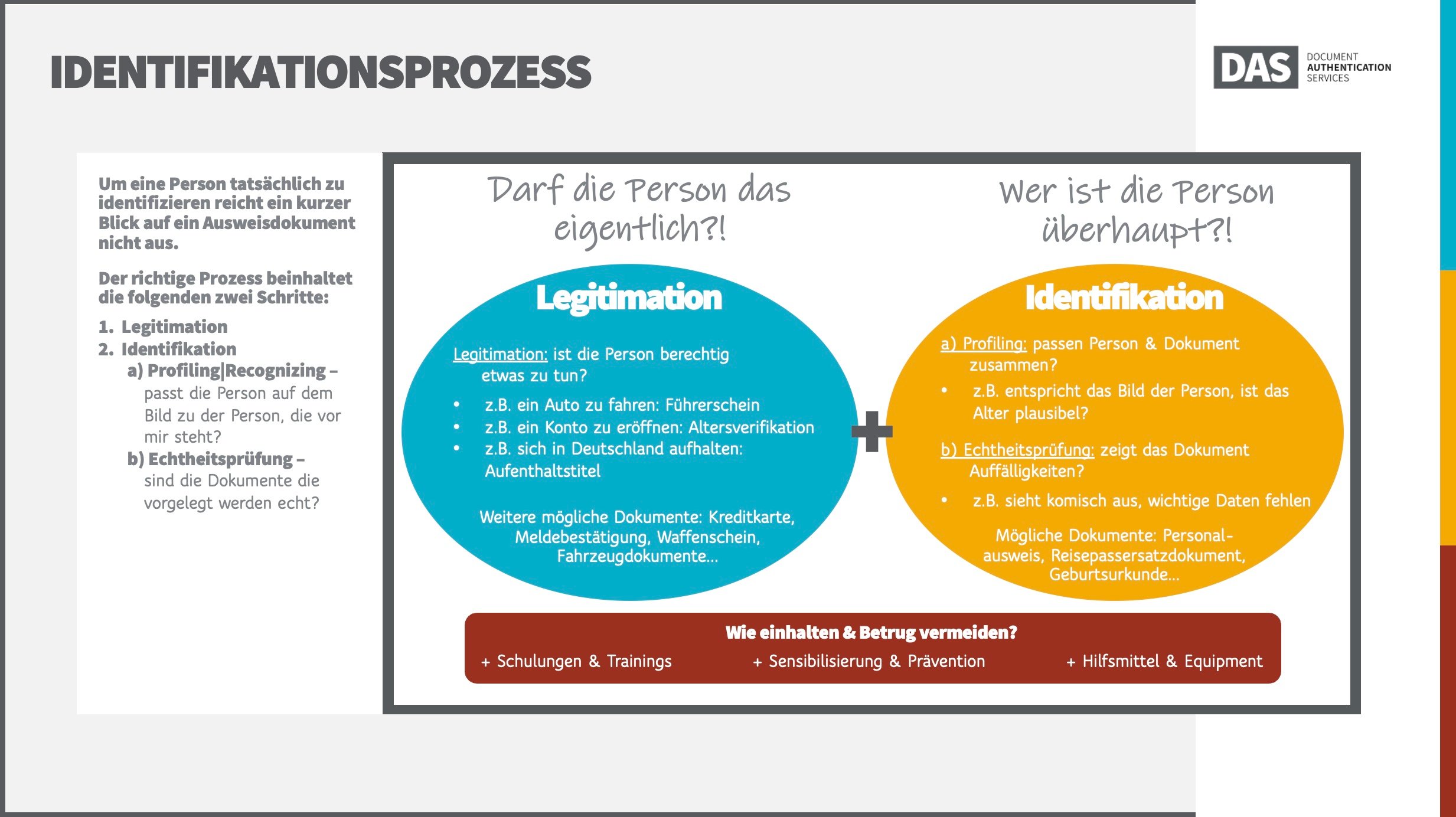 Um die Unterschiede deutlich zu machen, haben wir ein Schaubild für einen Identifikationsprozess erstellt. Unser DAS-Schaubild beinhaltet sowohl die Legitimation als auch die Identifikation in einer direkten Gegenüberstellung: